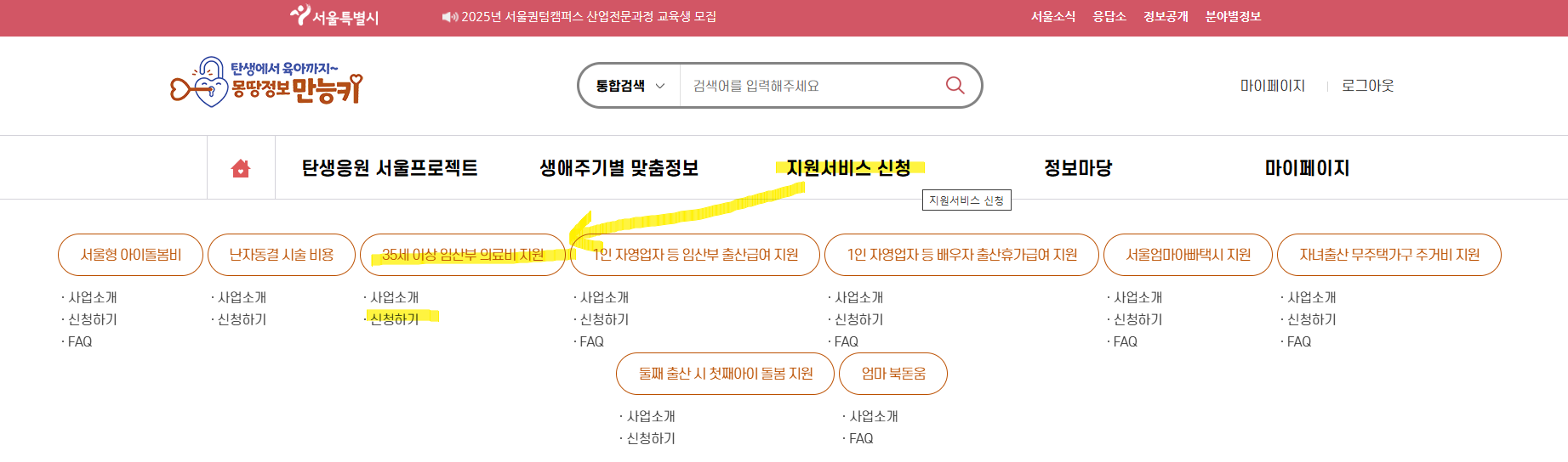 - 몽땅정보만능키에서 신청서 작성, 구비서류 첨부 (몽땅정보만능키 > 지원서비스신청 > 35세 이상 임산부 의료비 지원 > 신청하기)